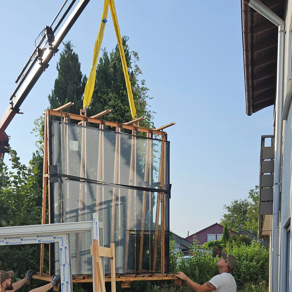 Der Einbau einer Hebeschiebetür dieser Größe ist alles andere als alltäglich. In Mönsheim durften wir für eine Kundin eine vier Meter breite Hebeschiebetür in den ersten Stock eines Altbaus integrieren. Das bestehende Mauerwerk war zu klein, das Element extrem schwer und die Platzverhältnisse im Altbau sehr begrenzt. Trotzdem war für unsere Kundin klar: Sie möchte mehr Licht, mehr Wohnkomfort und einen modernen, barrierearmen Übergang nach draußen schaffen.
